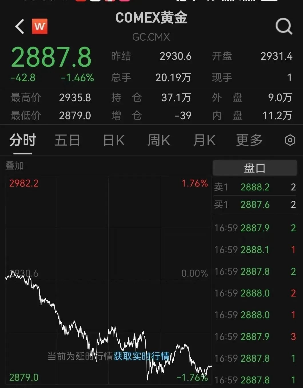 COMEX黄金期货跌1.46%,报2887.80美元/盎司。现货白银跌1.86%,报31.2630美元/盎司。COMEX白银期货5月合约跌2.24%,报31.845美元/盎司。