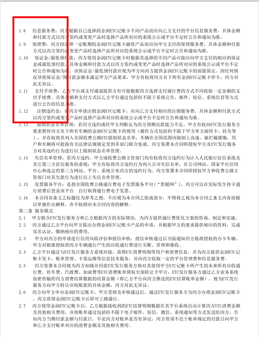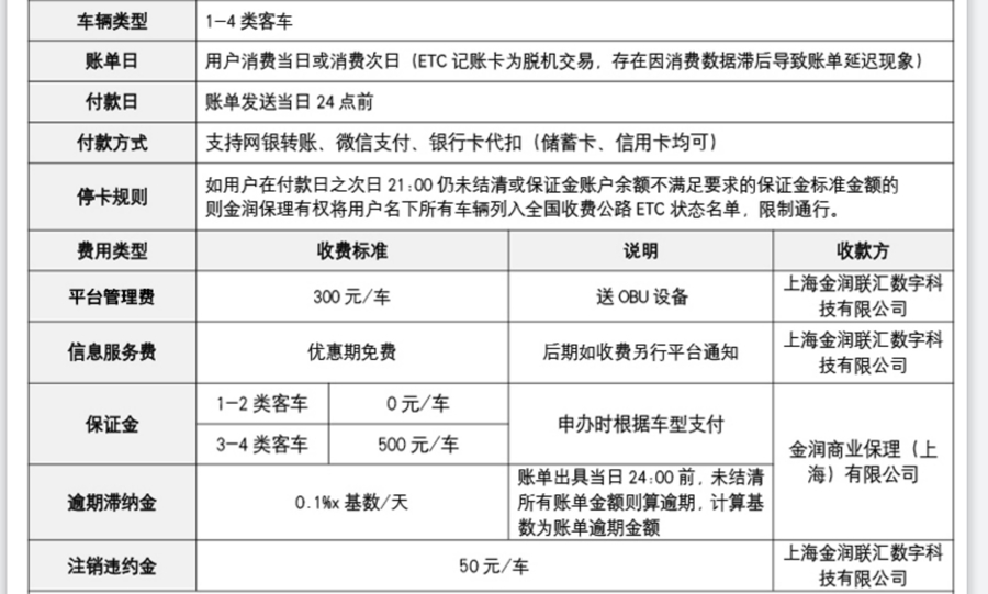 以刘先生的合同为例,总计26页,记者仔细翻阅合同发现,销售员口中的300元预存金,实际上是平台管理费,并非能随时提现、抵扣日常费用。因为在合同的最后一页,记者看到一份“金润ETC记账卡产品说明书”,提到平台管理费为300元/车,注销违约金为50元/车。此外,合同中列明的保证金更接近预存的概念,但也只有0元和500元两档。