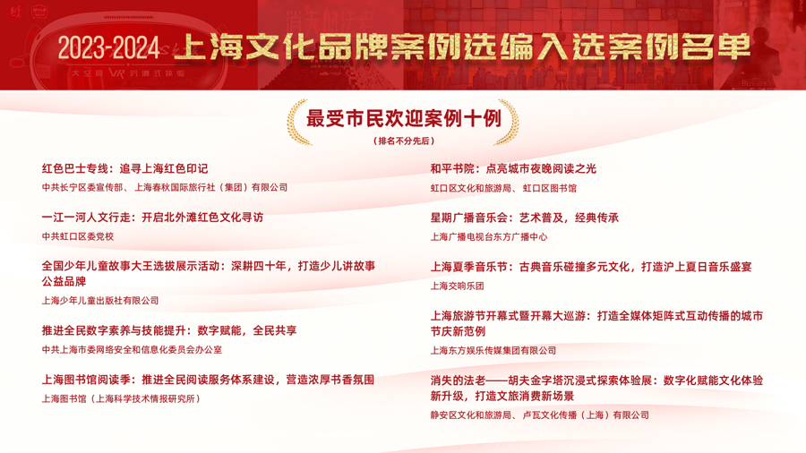 3月14日,2023-2024上海文化品牌案例选编成果发布会在中国金融信息中心举办,发布最具影响力、最佳创新发展、最受市民欢迎、最佳融合发展、最佳海外传播等5类50个上海文化品牌最佳案例。其中,“和平书院:点亮城市夜晚阅读之光”入选最受市民欢迎案例,“原神交响音乐会:打造跨文化视听盛宴,推动文明交流互鉴”入选最佳海外传播案例。