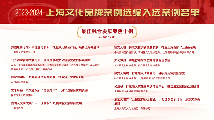 “中共一大纪念馆‘初心驿站’:打造红色空间品牌,为基层党建活动提供一站式解决方案”“一江一河人文行走:开启北外滩红色文化寻访”“电视剧《繁花》:抒写时代篇章,以电视艺术推动城市文旅发展”“打响‘精武文化’品牌,传承上海城市文脉”“龙华庙会:以文脉焕新‘古韵龙华’,用非遗聚合优质资源”“长三角江南文化研究学术共同体建设:打响长三角江南文化研究创新品牌”等特色案例,聚焦赓续鼎新城市文脉,生动体现了文化传承发展,用好用活红色文化、海派文化、江南文化三大文化资源的持续耕耘。