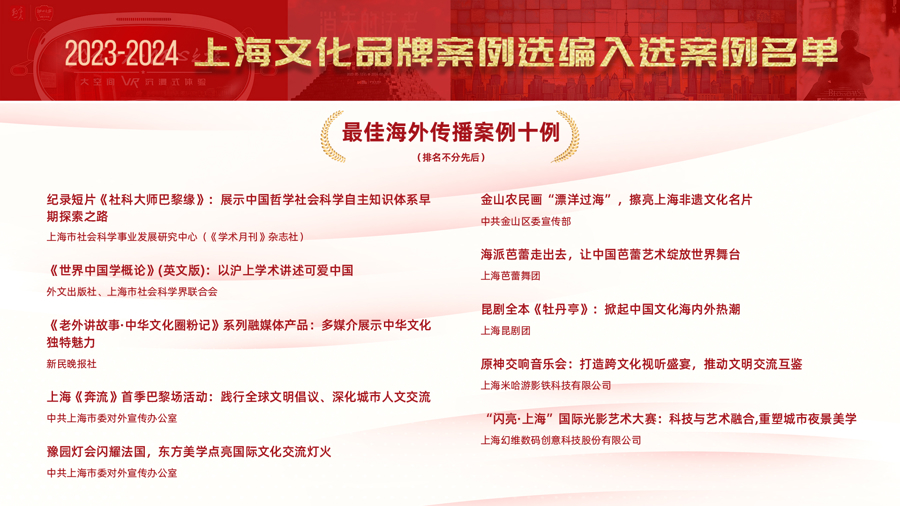 在提升国际传播能级,深入呈现讲好中国故事、增进文明交流互鉴的探索中,涌现了“上海《奔流》首季巴黎场活动:践行全球文明倡议、深化城市人文交流”“《世界中国学概论》(英文版):以沪上学术讲述可爱中国”“豫园灯会闪耀法国,东方美学点亮国际文化交流灯火”“《老外讲故事·中华文化圈粉记》系列融媒体产品:多媒介展示中华文化独特魅力”等特色案例。