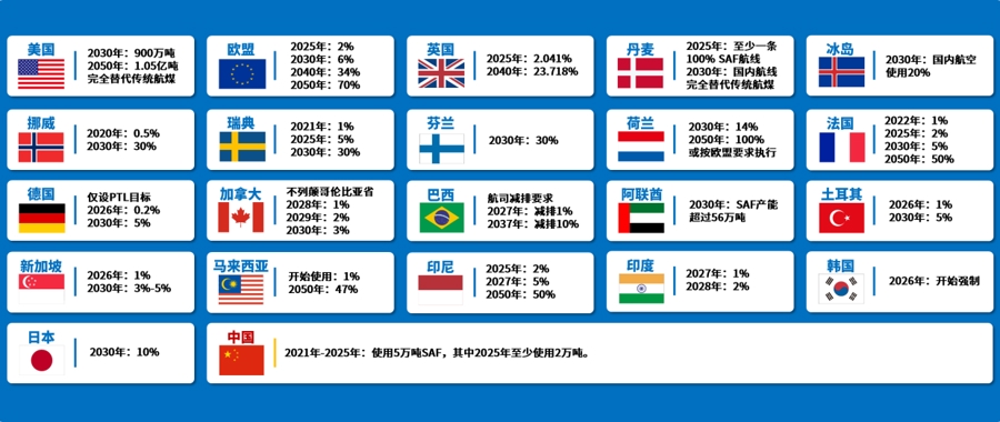 世界各国的SAF发展目标(来源:民航二所)