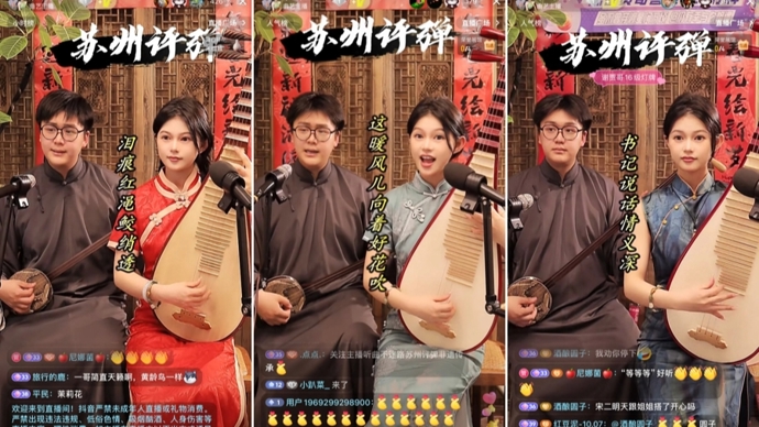 苏州评弹已有400年历史,上世纪初风靡于江浙地区,数百家评弹书场经营火爆。上世纪80年代,在众多娱乐方式的冲击下,苏州评弹一度落寞,大量专业演员转行。本世纪初,随着苏州旅游业的发展,平江路上大大小小的茶馆都唱起了评弹,吸引着接踵而至的游客。如今,随着演艺直播的兴盛,越来越多“宋一宋二”这样的评弹演员涌入直播间,寻找新舞台。