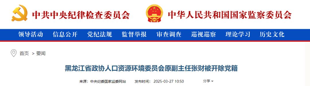 据黑龙江省纪委监委消息:日前,经黑龙江省委批准,黑龙江省纪委监委对黑龙江省政协人口资源环境委员会原副主任张财严重违纪违法问题进行了立案审查调查。