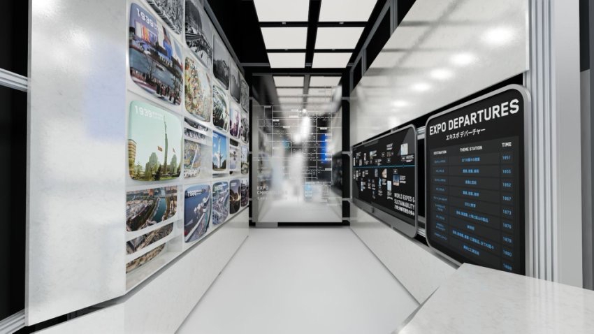 展区以交通枢纽为概念,打造一个世博会各届主题为“站点”,串联世博会在不同阶段的重大事件和在可持续发展中的⻆色,展示世博会与全球环境、文化、科技等领域的创新与合作。