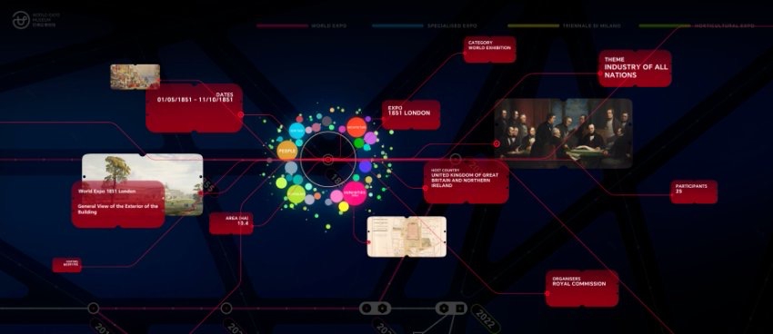此次世博馆展示的重点展项,通过数字化、数据可视化、GIS等手段,着力于打造呈现世博发展脉络的数据库。该项目不仅与国内文化机构开展合作,也与全球其他世博会举办城市的文化机构开展联络,得到了1851年伦敦世博会皇家委员会的支持。后者无偿提供南肯辛顿地块在举办万国工业博览会之后这个区域逾百年的发展规划资料,凸显大型盛会的举办对于城市更新的意义与持久影响。