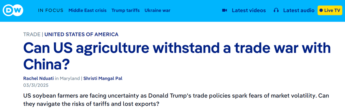 德国之声3月31日报道称,特朗普的贸易政策引发市场动荡担忧,美国大豆种植户面临巨大的不确定性。美国大豆出口,特别是对华出口,多年来一直在下降。特朗普贸易政策对农民的全面影响可能要等到下一个收获季才会完全显现。