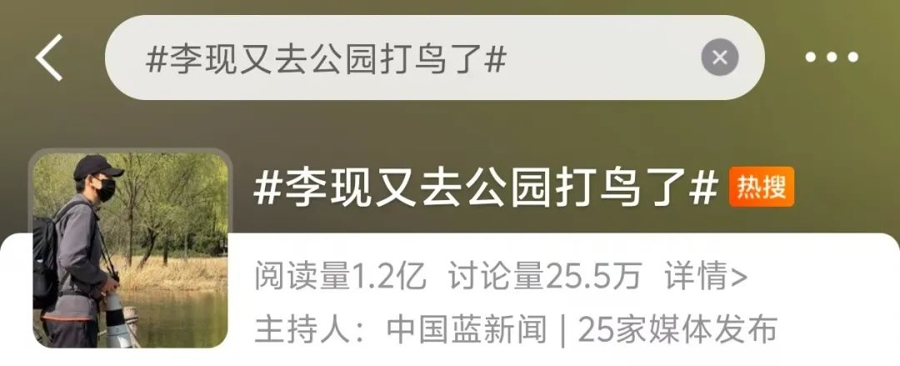 最近,多名网友在北京的公园中发现了正在拍摄野生鸟类的演员李现,他在社交平台上分享的“打鸟作业”被生态环境部点赞。为此,全国各地纷纷向李现和广大鸟类爱好者发出“来我们这里‘打鸟’”的邀请。