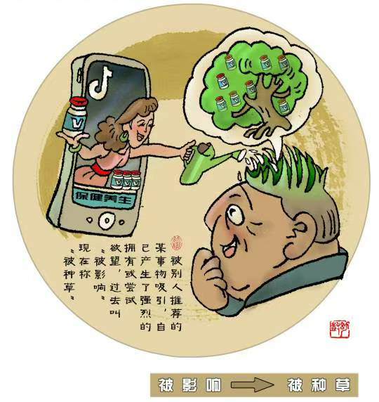 被别人推荐的某事物吸引,自己产生了强烈的拥有或尝试欲望,过去叫“被影响”现在称“被种草”。