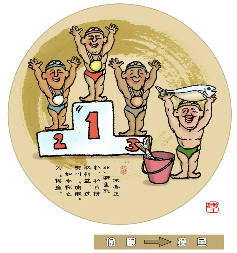 不务正业, 避重就轻,私自捞取利益,过去叫“偷懒”,如今称之为“摸鱼”。