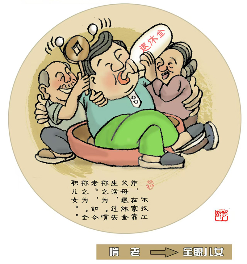 不找工作,在家靠父母退休金生活。过去称之为“啃老族”,如今称之为“全职儿女”。