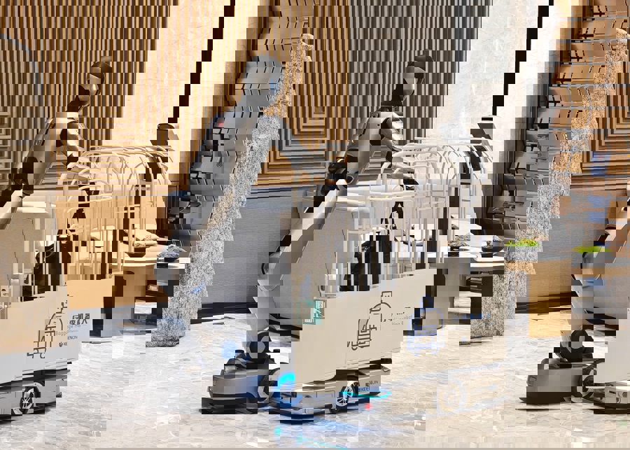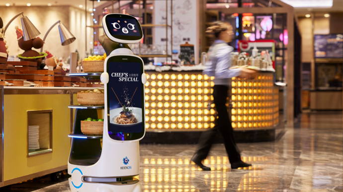 立足餐饮场景,擎朗开始快速拓展商场、酒店、医疗、教育、机场等场景,从中国拓展到全球,机器人的品类和功能也在扩大,从移动配送到清洁、引导、消毒、教育、娱乐等。在酒店客房里,门铃响起,机器人把外卖送到了门口后,自行乘坐电梯返回;在餐厅内,机器人穿过来往的客人,把餐食送到了顾客餐桌;在医院内,机器人将检测标本第一时间送到检验科……擎朗机器人服务的画面已经成为生活中常见的场景。