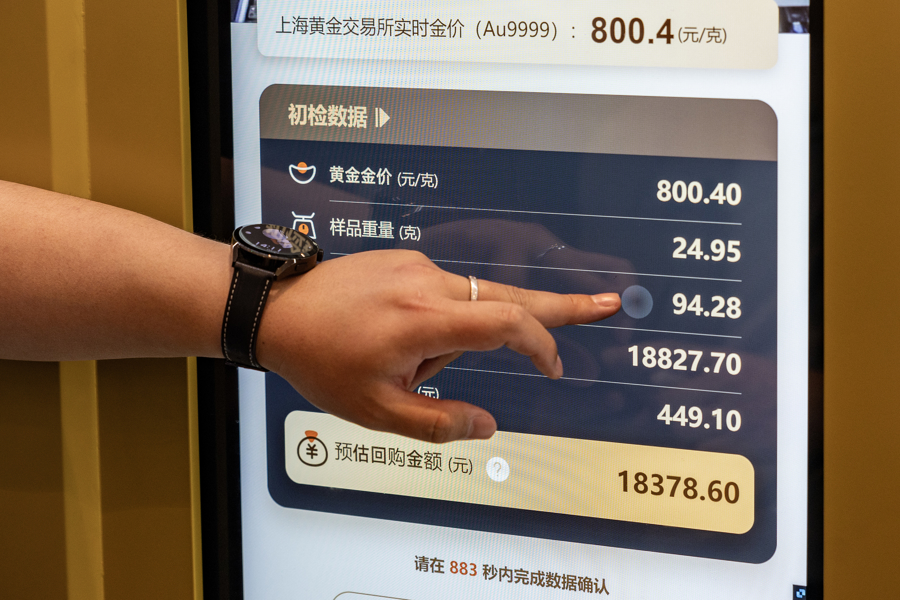 “黄金买卖真的可以这样便利,就像在银行的‘ATM’上,存取款一样方便。”4月21日,家住普陀区的刘阿姨和先生带着她出嫁时的一些黄金首饰来尝试。在现场工作人员的指导下,刘阿姨的黄金首饰经过设备初检、实名身份信息输入、再进行了二次检测后,两只金手镯和一枚金戒指系统显示回收价格为36820元。