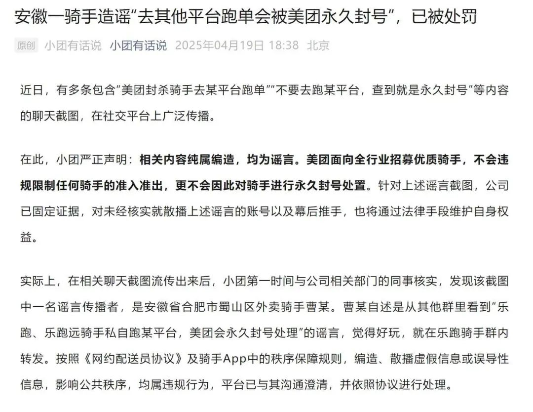 红星新闻记者注意到,前不久,有多条涉及“美团封杀骑手去某平台跑单”“不要去跑某平台,查到就是永久封号”等内容的聊天截图在社交平台广泛传播。对此,美团官方公众号@小团有话说4月19日发文辟谣,称上述聊天截图中一名传谣者,系安徽合肥蜀山区的外卖骑手曹某。文章透露,曹某自述是从其他群里看到“乐跑、乐跑远骑手私自跑某平台,美团会永久封号处理”的谣言,觉得好玩,就在乐跑骑手群内转发。