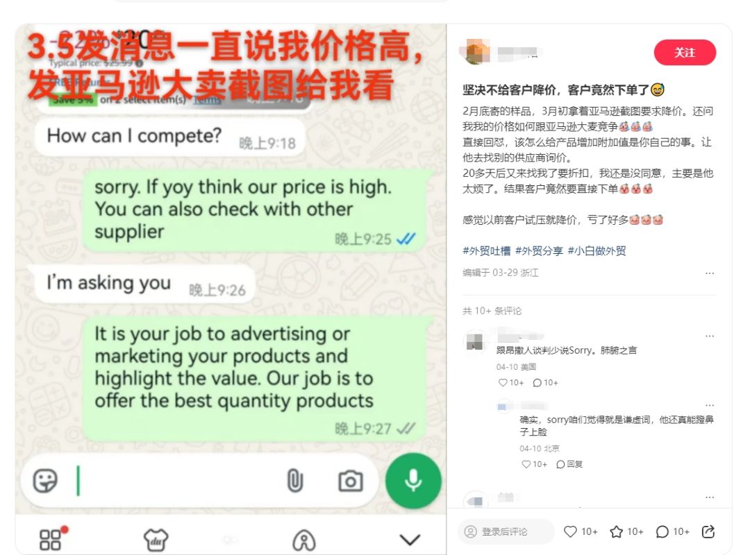 2023年,Elaine在杭州自主创业,经营家纺外贸生意,3月底,一位美国客户在向她询价时施压降价,在利润空间不断压缩的环境下,Elaine拒绝了对方的请求,没想到最后客户直接下单了。她将这件事分享在小红书后获得了大量留言和点赞,其中不乏服装厂商和外贸从业者。