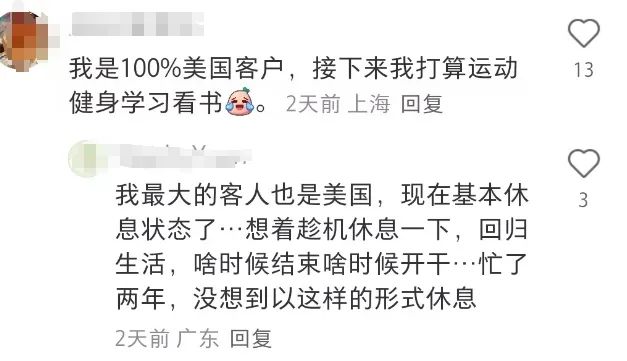 广东博主石头哥的淡定心态赢得不少粉丝点赞,石头哥的公司主要生产保护类产品如手机保护壳,90%客户在美国。“这是我的真实想法,因为慌张也没用。”石头哥表示,倒是笔记评论区里上千条评论让他很意外,一方面很多人帮他“出谋划策”,有人列出仍在正常下单的美国中小买家名单,还有物流从业者提供优惠的出海方案。而令他最有共鸣的是有人回复“趁这段时间好好陪伴下家人”,因为跟美国客户有时差,他们往往要凌晨工作,很少有时间休息和陪家里人。