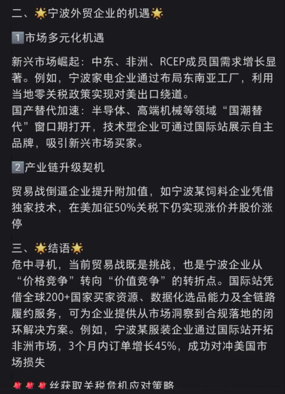 小红书上,有人支招开拓市场新方向,有人建议:“中东、非洲等地需求增长显著,对于宁波的家电企业拓展市场是个机会。”有人分享谈判经验,“美国找不到替代品,硬气一点反而赢得尊重。”有用户在小红书找到内销批发商,评论区变身“线上1688”。