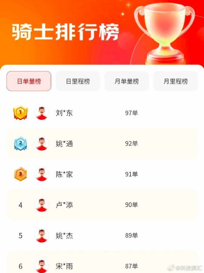 4月22日,网上一张图片显示,“刘*东”以97单的单量排在京东骑手排行榜“日单量榜”第一名。22日晚,京东方面回复记者,此为不实信息,榜单排名为虚构。