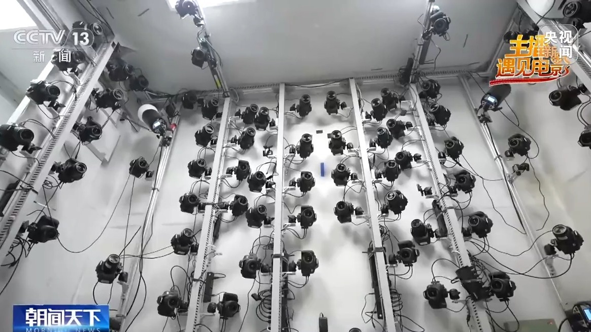 张韬:这个动作捕捉服的穿戴很有讲究,根据骨骼关节的位置将67个反光点贴满全身,再去到动捕区里。 动捕区四周有大型的钢架,钢架上有动捕机器,捕捉动捕服上的反光点,最后生成一个数字人物形象。这套动作捕捉系统可以做到实时渲染,连手指等细节都不放过,精度达到亚毫米级。