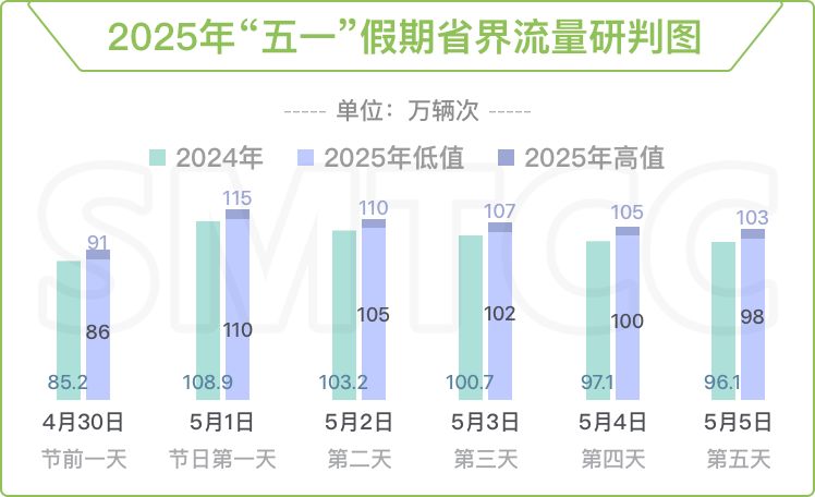 今年“五一”假期7座及7座以下的小型客车免费通行全国收费公路时间为5月1日0时至5月5日24时。预计“五一”假期全国高速公路日均流量约为6200万辆,跨省车流量与新能源车流量双增长。新能源汽车日均流量占日均总流量近20%,同比明显增长。4月30日18点至20点为节前高峰时段;5月1日假期首日,跨省中长途出行集中,10—12点将出现出城拥堵高峰;5月4日开始,返程高峰显现,时段性拥堵突出,16—18点将出现返程拥堵高峰。