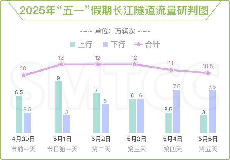 节日期间,预计长江隧道日均流量为11.5万辆次,与去年同期大体相当。其中上行(江苏方向)5.7万辆次,下行(市区方向)5.8万辆次。长江隧道流量方向性明显,节前一天及首日,长江隧道流量以上行(江苏方向)为主;节日最后两天,长江隧道以下行(市区方向)为主。
