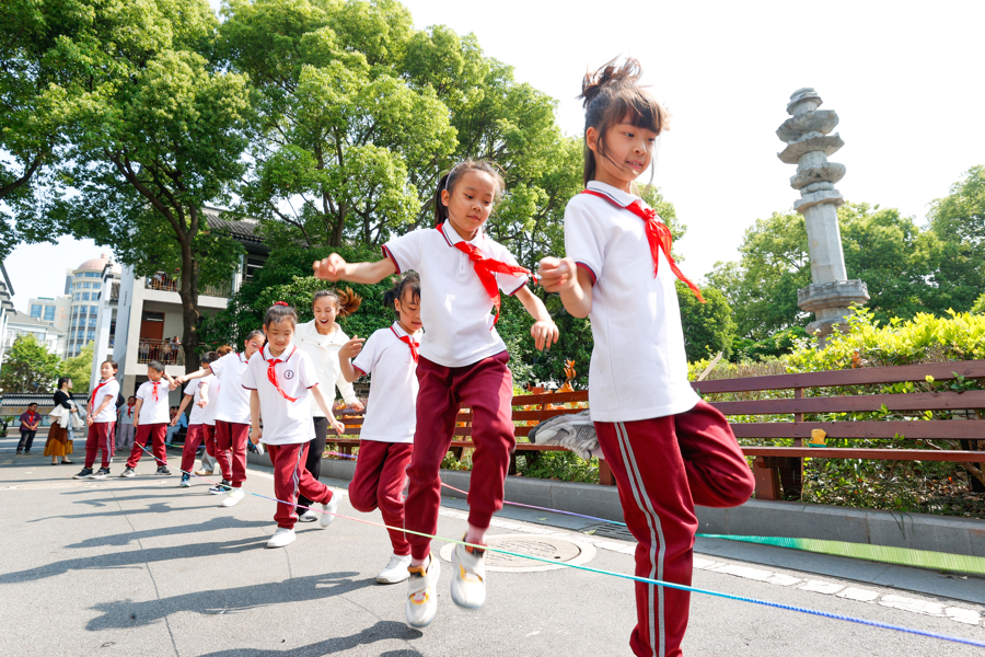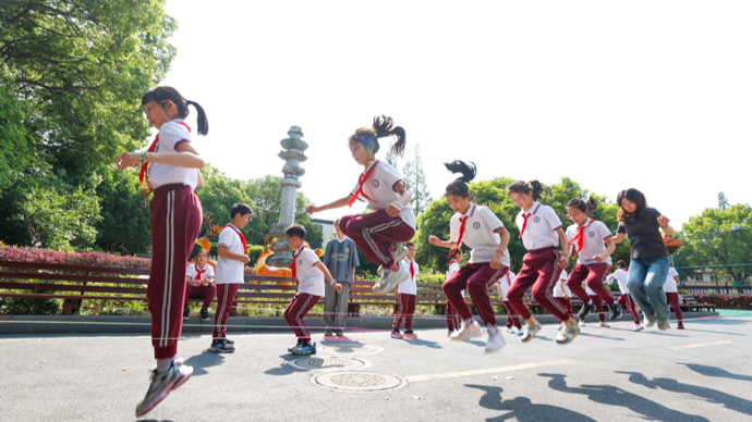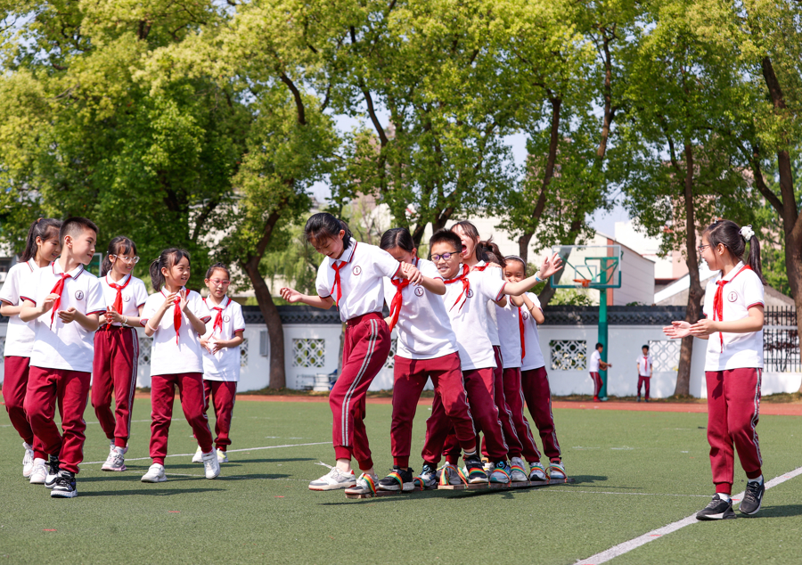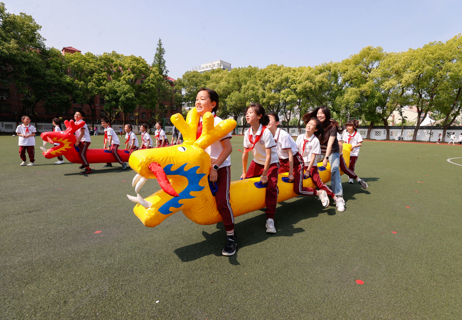 4月28日,上海市松江区中山小学学生在校园里跳橡皮筋、体验充气“龙舟”运动、玩板鞋竞速等活动,乐享大课间运动快乐。近年来,该校落实“双减”政策,推行阳光课间行动,将传统游戏融入大课间活动,让学生们“脸上有笑、背上有汗、眼中有光”,在趣味运动中健康成长。