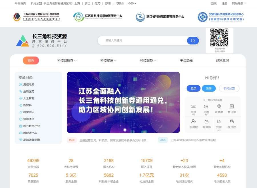 长三角科技资源共享服务平台网站截图。