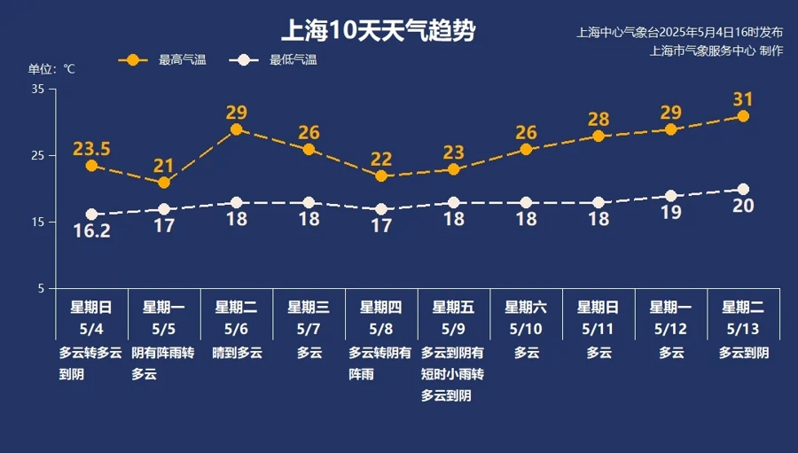 五一小长假过后,上海将会迎来两天左右的晴好天气,气温迅速回升,6日的最高气温可达29℃左右。8日前后受新一股冷空气影响,上海又将会出现一次比较明显的降水过程。降雨加上大风,气温将会再次回落至22、23℃附近。双休日,申城天气恢复平静,以多云为主,最高气温再次上升。