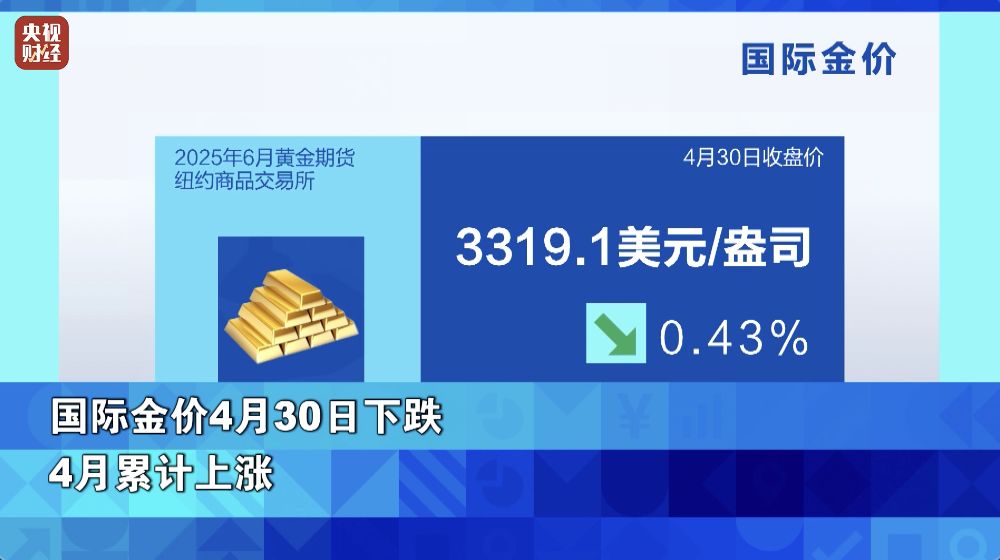 国际金价方面,美国政府释放的贸易谈判积极进展消息,引发国际金价周三加速下跌,欧洲交易时段一度跌超1.7%,随后跌幅有所收窄。截至收盘,纽约商品交易所6月黄金期价收于每盎司3319.1美元,跌幅为0.43%。整个4月,受美国政府关税政策和美联储降息前景影响,国际金价累计上涨5.36%,连续第四个月上涨。