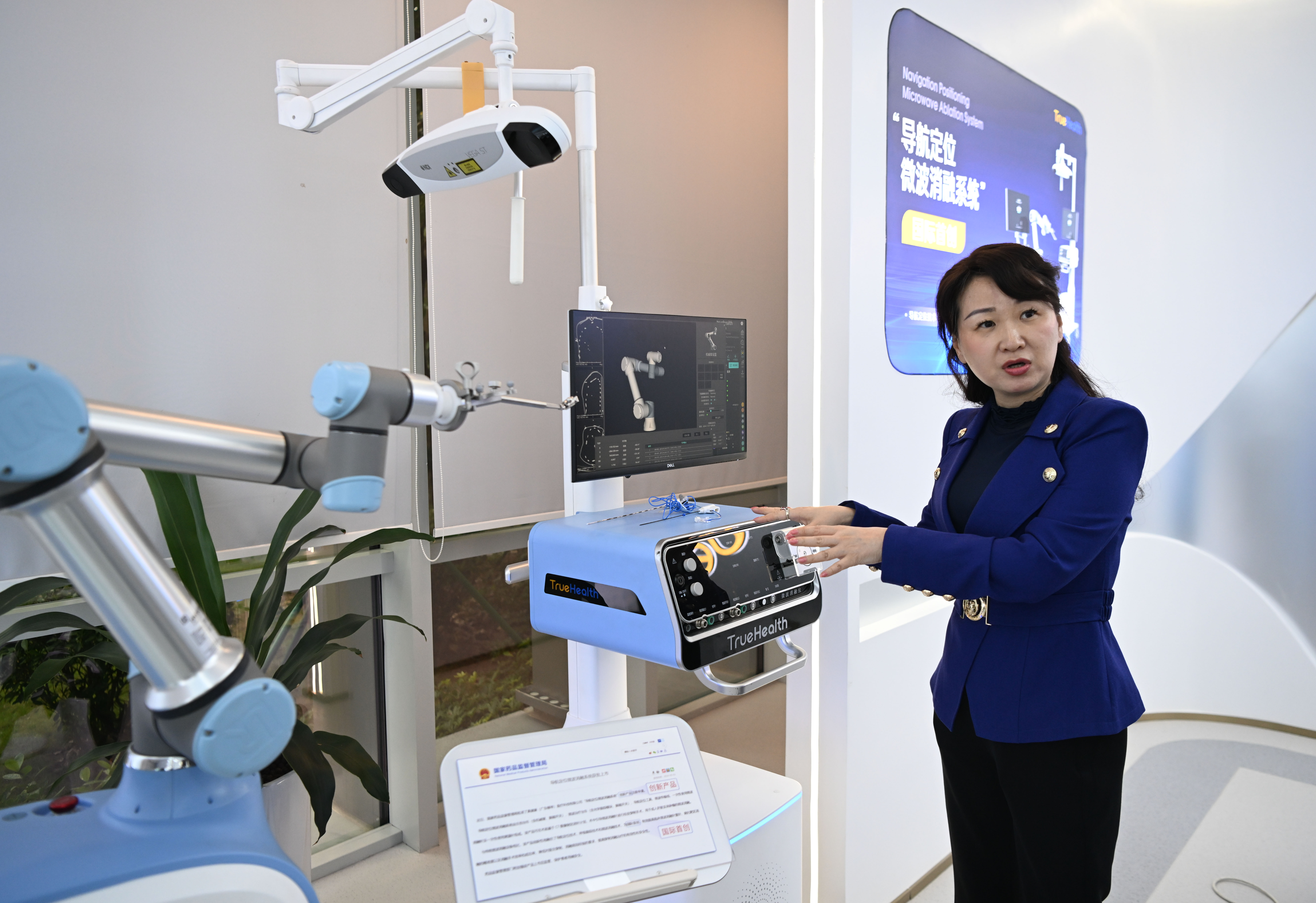 澳门企业真健康(广东横琴)医疗科技有限公司创始人张昊任在介绍“导航定位微波消融系统”(2024年11月24日摄)。新华社记者 邓华 摄