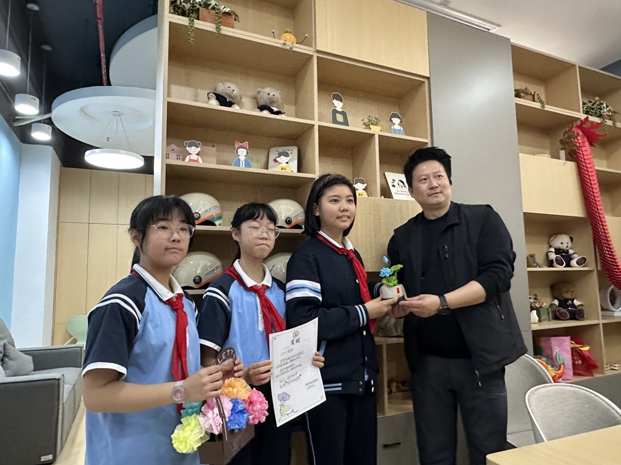 物业经理王廷钧收到了人生中最特别的一张奖状——“隐形的翅膀奖”,上面画着一朵盛开的牵牛花。“牵牛花的花语是勤劳朴实的人。我觉得他们非常靠谱,比如,教室的粉笔盒里永远有好写的粉笔,我们发现桌椅有缺角或者晃动,不知道什么时候,就换成全新的了。”预备4班女孩陆萄穁说。“我用扭扭棒做了一盆花,也想送给物业的叔叔阿姨。这些花是蓝色的,因为……我们桌面就是蓝色的!”预备(4)班苏子懿补充。预备(12)班女孩陈翊瑄的一篮“餐巾纸手作花”颜色缤纷,“不同颜色代表不同岗位,他们就像是全能的!”