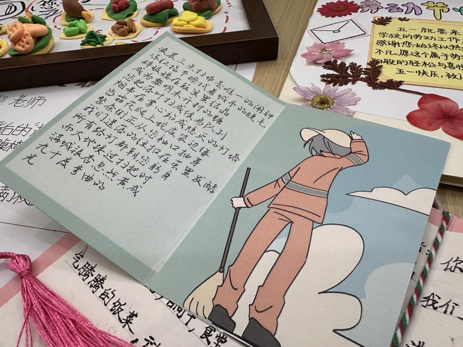同样收到惊喜的,还有保安师傅、食堂大厨、后勤工作人员等校园里的普通劳动者们。校长王珏介绍,为了让同学们理解劳动者的平凡和不凡,学校不仅组织了各班学生通过在不同岗位上体验和实践,也鼓励各班设计有心意的礼物,感谢他们的默默付出。