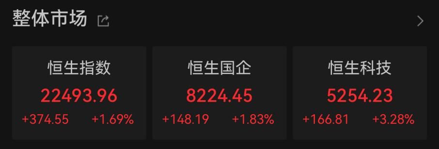 5月2日,港股三大股指高开后持续走高。截至午间收盘,恒生指数涨1.69%,报22493.96点;恒生中国企业指数涨1.83%,报8224.45点;恒生科技指数涨3.28%,报5254.23点。