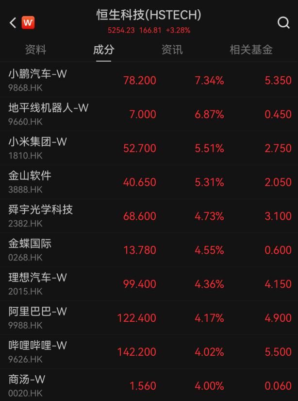 恒生科技指数成分股中多只个股大涨,汽车产业链相关个股涨幅居前。小鹏汽车-W大涨7.34%,地平线机器人-W大涨6.87%,小米集团-W、金山软件涨超5%,理想汽车-W、阿里巴巴-W、哔哩哔哩-W等涨超4%。