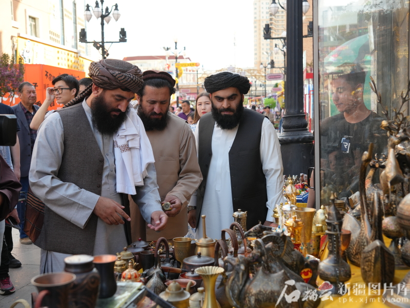 访华团漫步在新疆国际大巴扎。石榴云/新疆日报记者 闫啸天摄