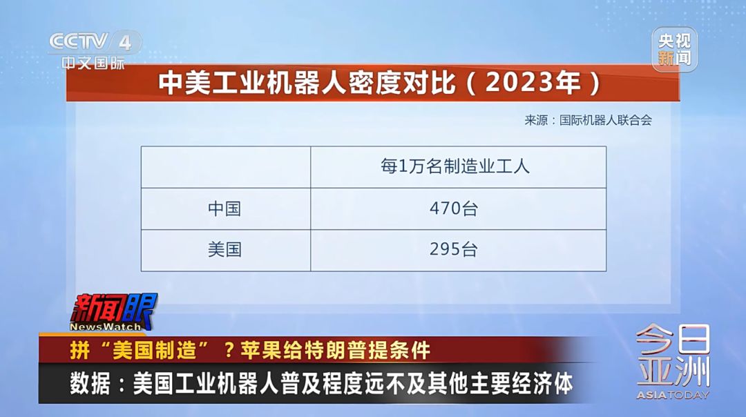 美媒认为,机器人被美国政府视为解决美国制造业熟练劳动力与技术人员短缺的捷径,事实上,目前美国工业机器人的普及程度远不及其他主要经济体。数据显示,2023年,中国每1万名制造业工人对应470台工业机器人,美国每万人只有不到300台。