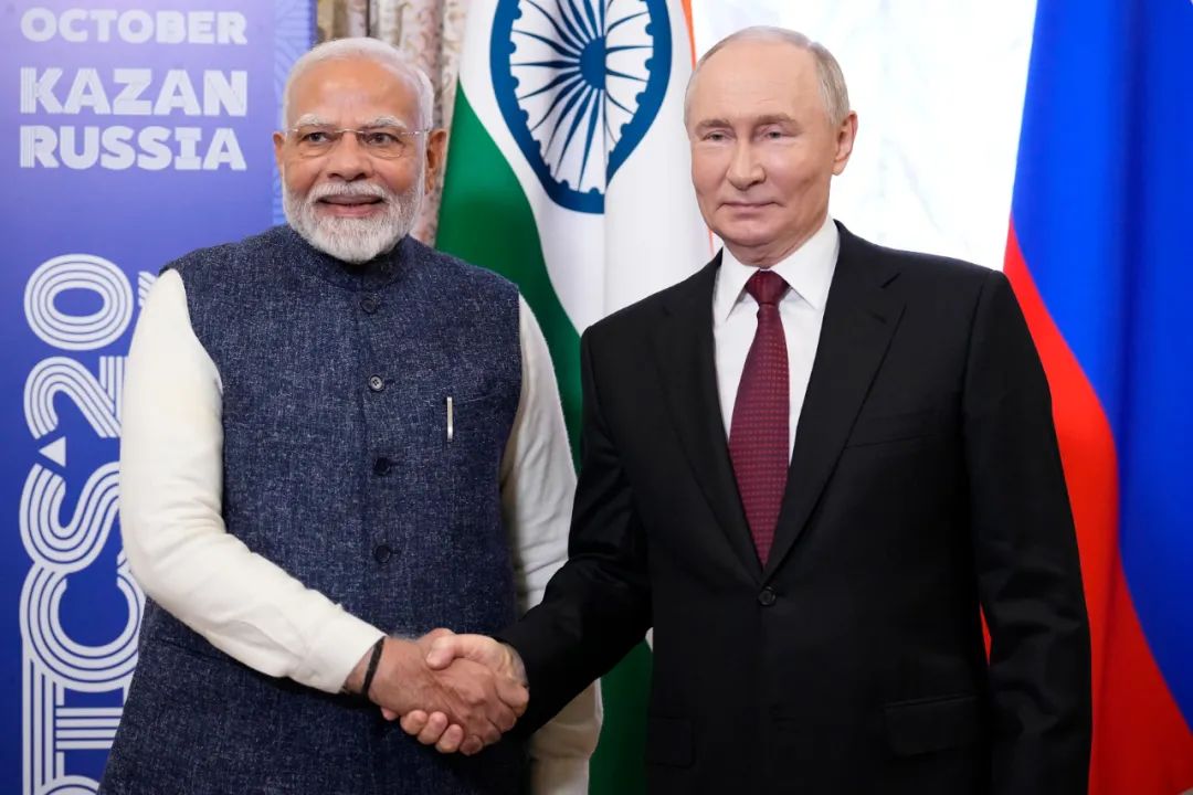 ▲资料图片:2024年10月22日,俄总统普京(右)与印度总理莫迪在出席俄罗斯喀山金砖峰会期间举行会晤。(美联社)