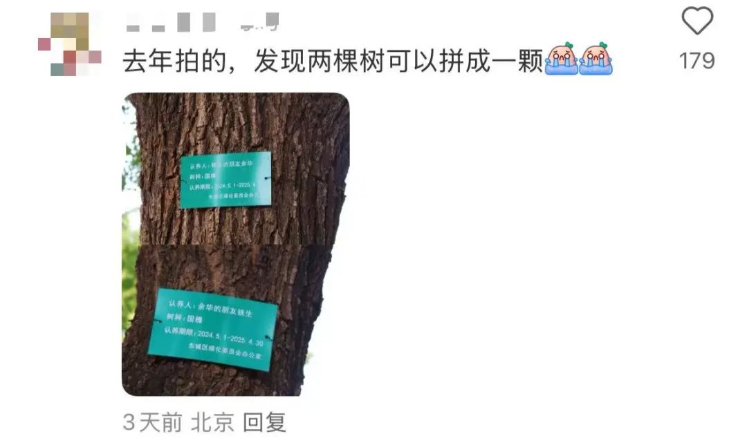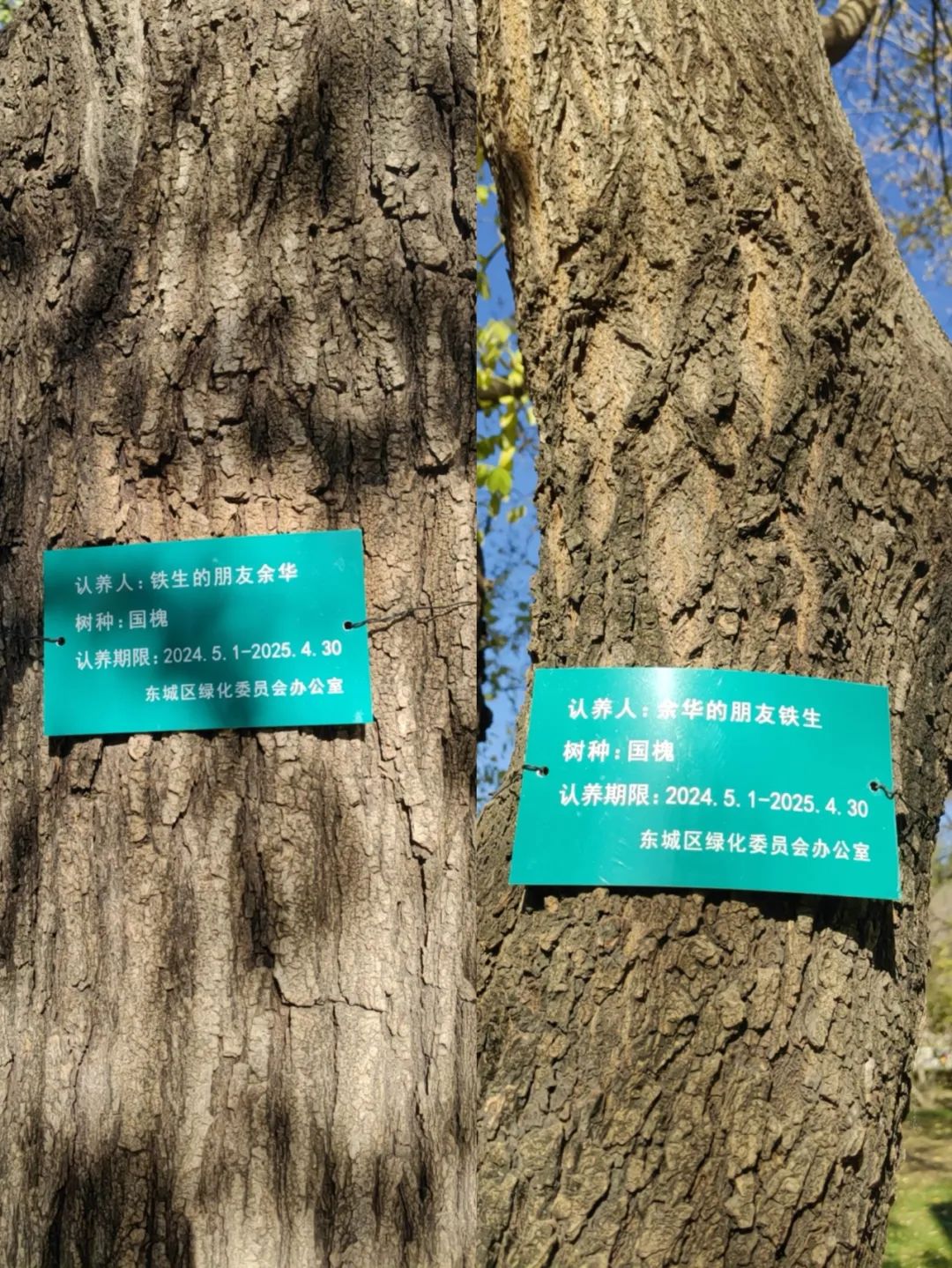 网友发帖显示,两棵国槐树树干上挂着两块牌子,分别写着“认养人:余华的朋友铁生”“认养人:铁生的朋友余华”,认养期限均是从2024年5月1日到2025年4月30日。