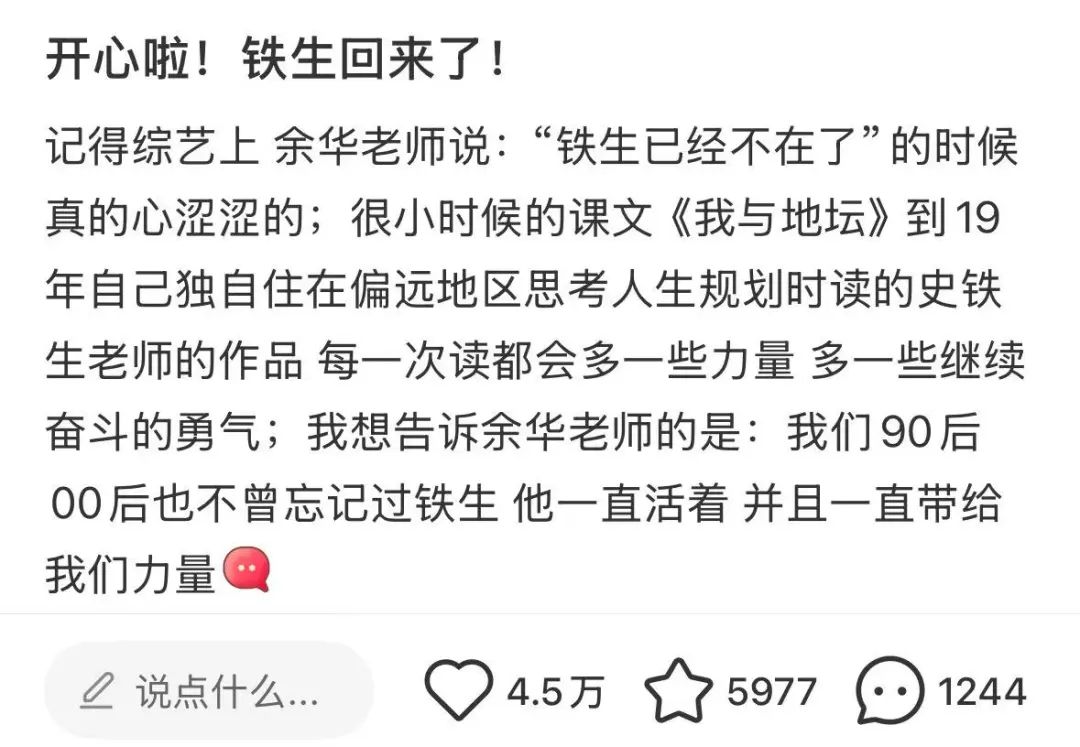 “这是余华老师帮史铁生认养的吗”“本来没什么感觉的,这两个名字放在一起突然很想哭”,有网友评论道。