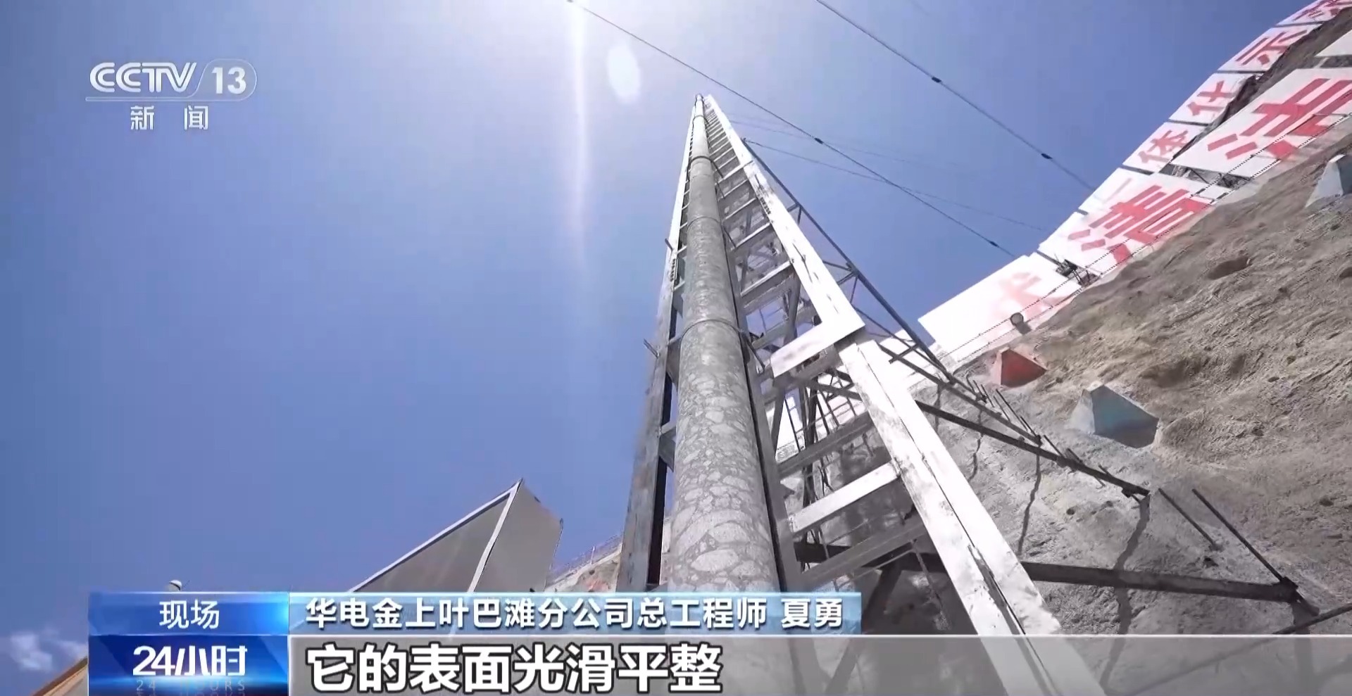 华电金上叶巴滩分公司总工程师 夏勇:我们可以看到,这根芯样它的表面光滑平整,混凝土骨料分布均匀,胶结清晰完整,尤其是混凝土层间结合得比较好。这次芯样长度破纪录,标志着我国高海拔寒冷地区拱坝混凝土筑坝技术居于世界领先水平。