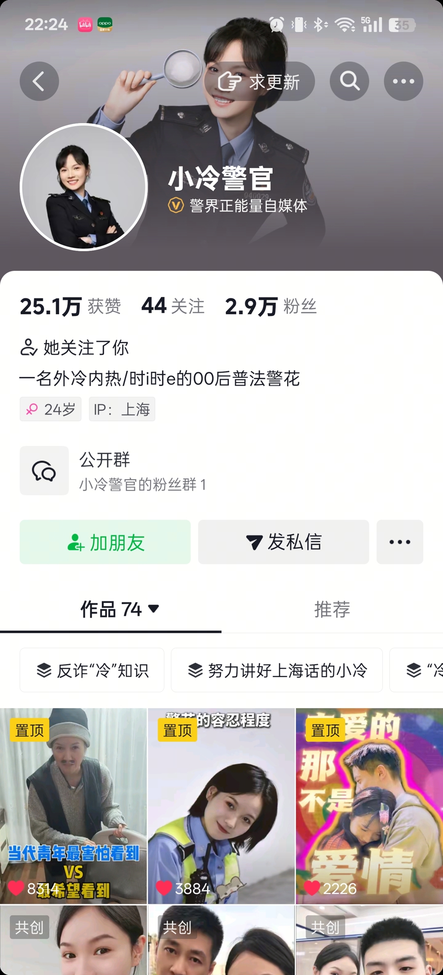 去年5月,杨浦公安分局在抖音、B站等平台率先打造上海唯一的警务IP个人账号“小冷警官”,先后发布《反诈“冷”知识》《“冷”知识要知道》等系列短视频,将新型诈骗手法、交通安全知识等内容拆解为生动案例,通过情景演绎、改编歌曲等形式,总结凝练生活中应当注意的安全常识以及防范电信网络诈骗的要点。因为作品幽默接地气、科普性强,多次被国家反诈中心、公安部新闻传媒等账号转发。
