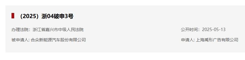 5月13日,记者从全国企业破产重整案件信息网了解到,哪吒汽车关联公司合众新能源汽车股份有限公司新增一则破产审查案件,申请人为上海禹形广告有限公司,经办法院为浙江省嘉兴市中级人民法院。