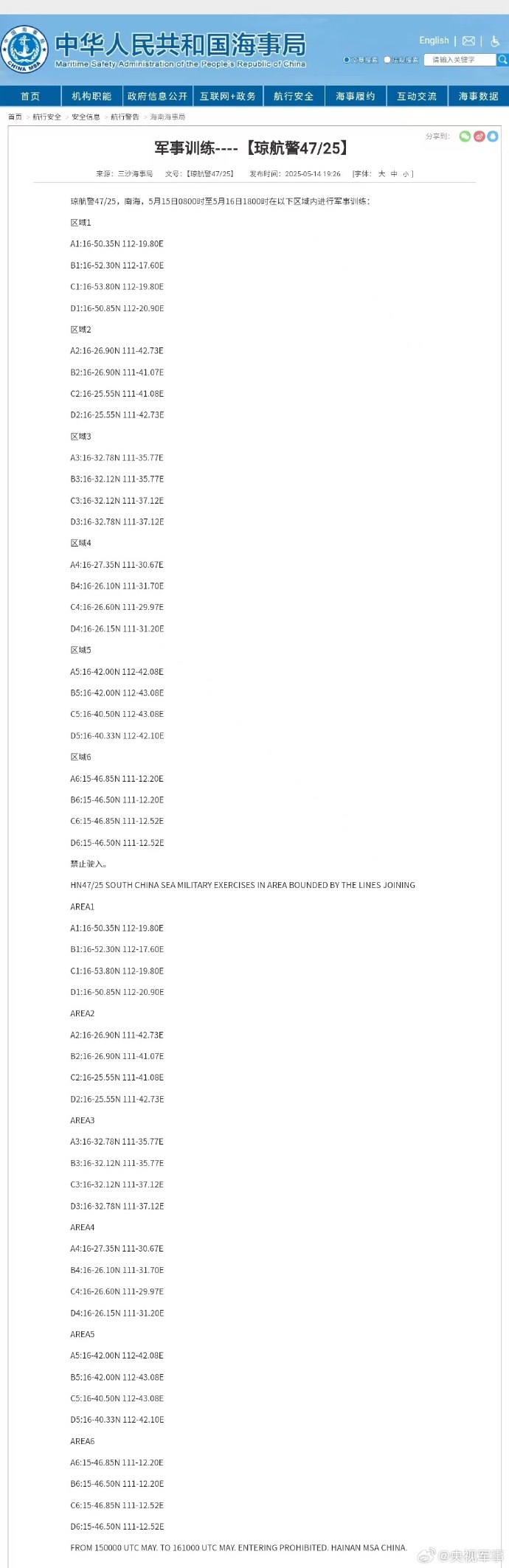 原标题:《航行警告!南海6个海域军事训练,禁止驶入》
