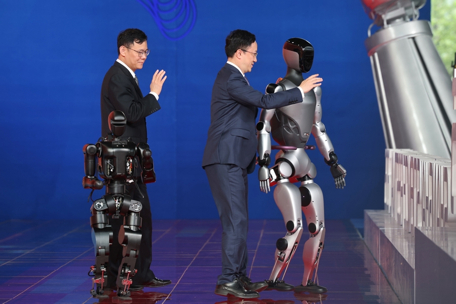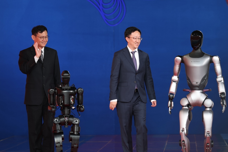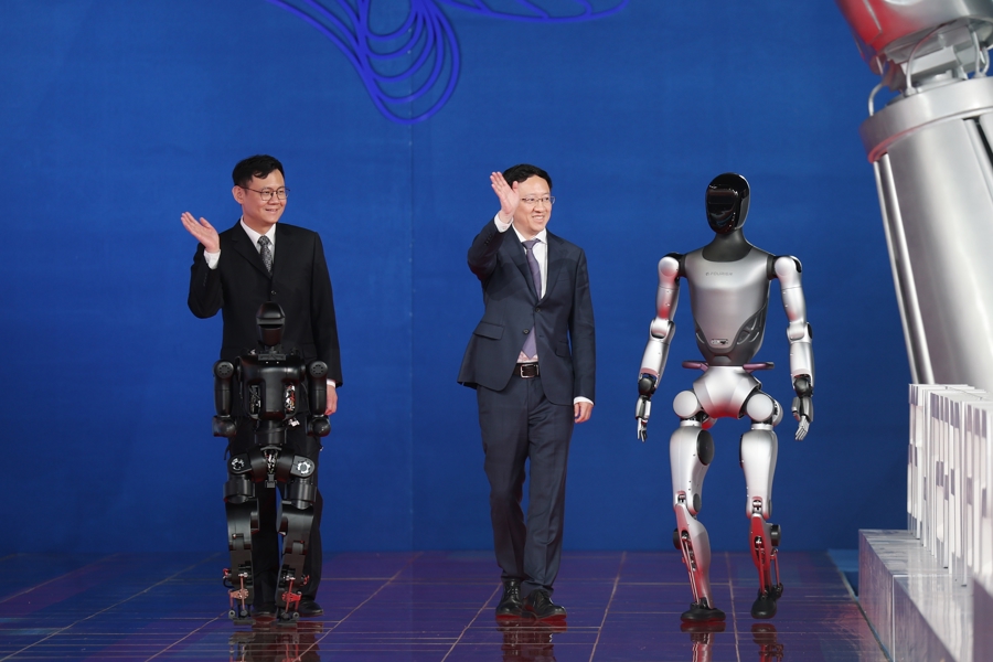 傅利叶创始人兼首席执行官顾捷、傅利叶副总裁曾翔与两台人形机器人走上红毯。