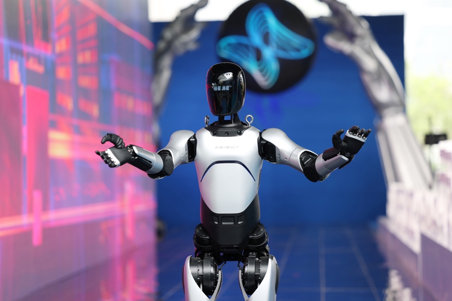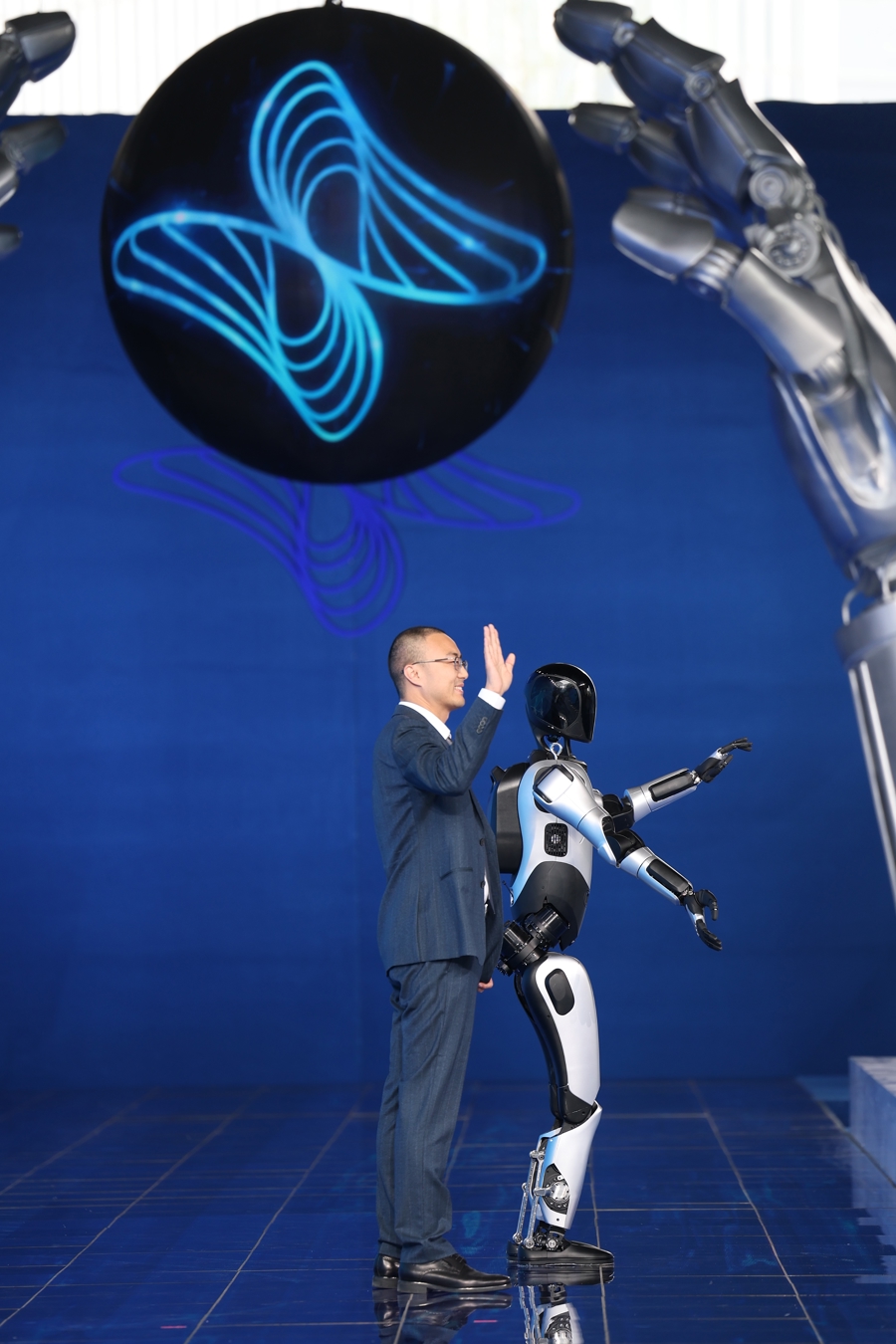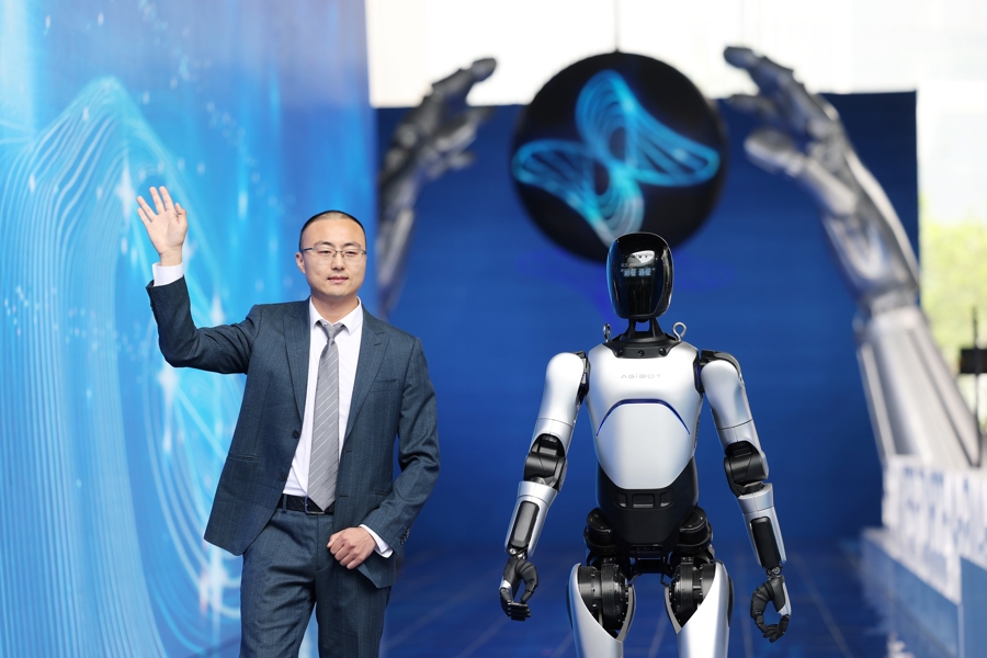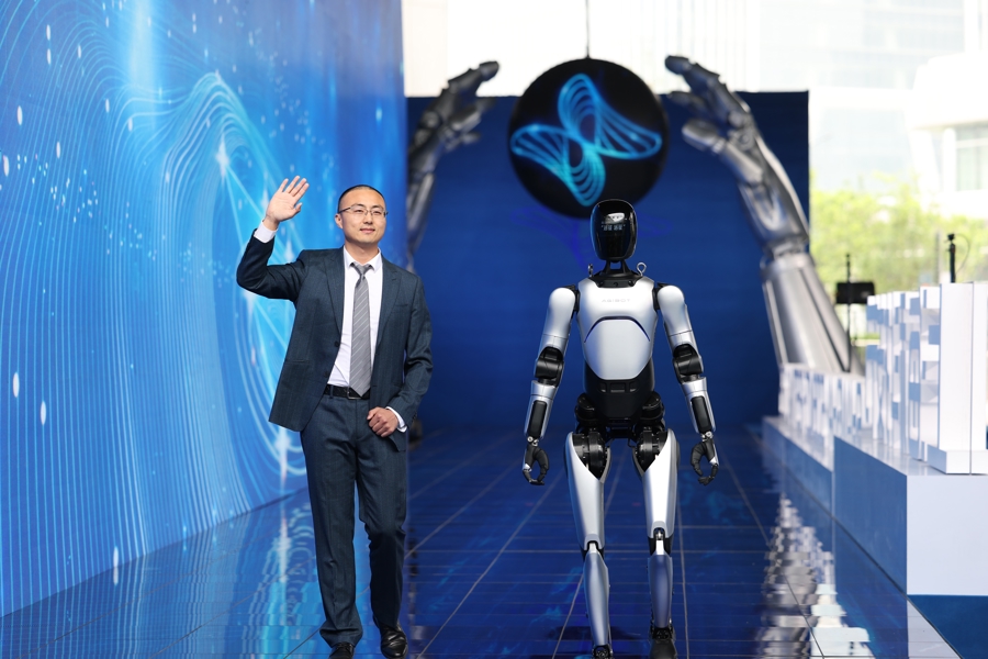 智元通用产品线总裁王闯和“远征A2”机器人一起走上红毯。