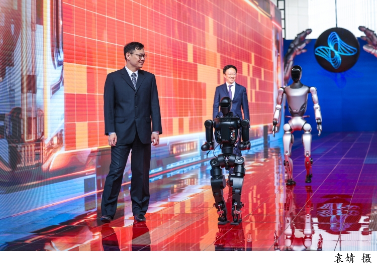 图为上海傅利叶智能科技有限公司副总裁曾翔(左)、上海傅利叶智能科技有限公司创始人兼首席执行官顾捷(右),带着傅利叶N1开源人形机器人(左)和傅利叶GR-2通用人形机器人(右)走上科学红毯。