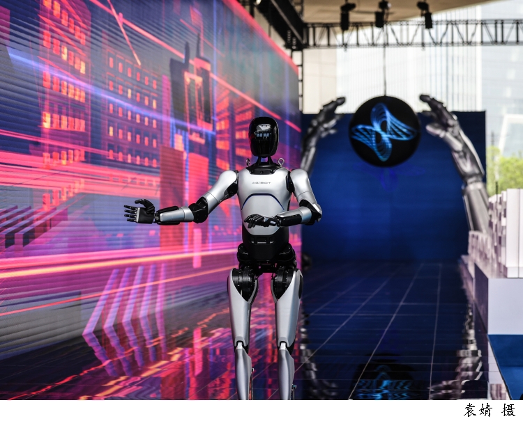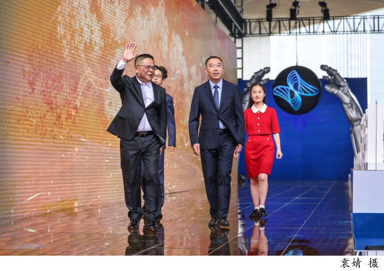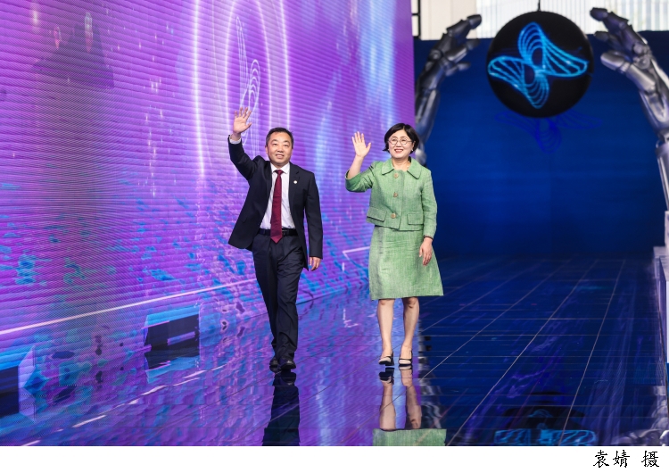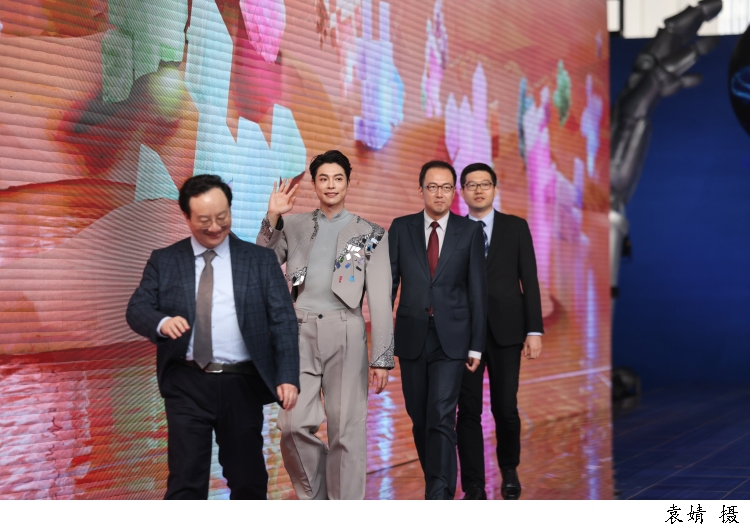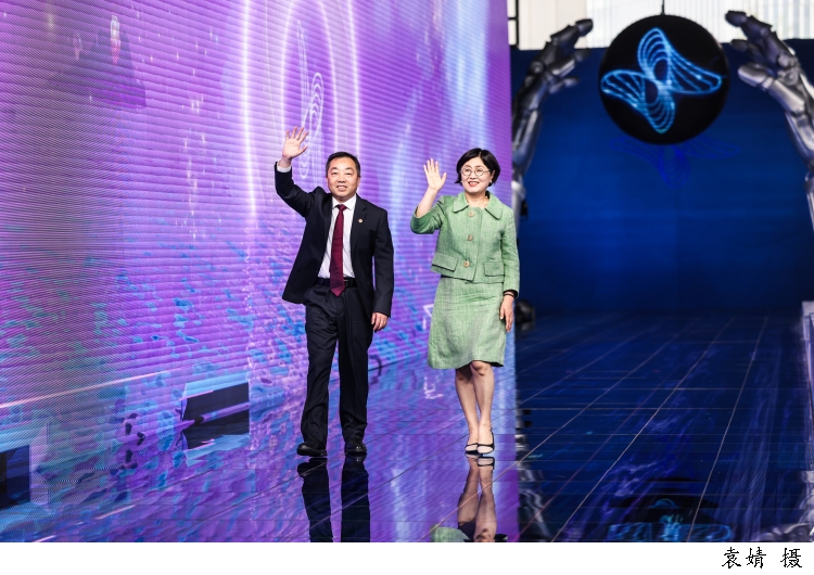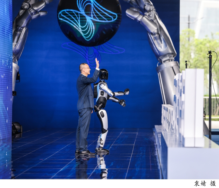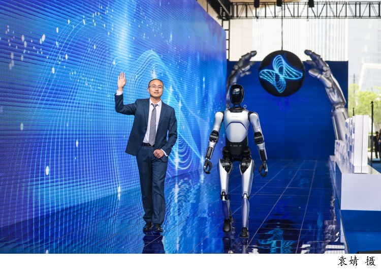 图为上海智元新创技术有限公司通用产品线总裁王闯带着智元远征A2机器人走上科学红毯。面对观众的欢呼,机器人幽默地打起了太极拳以示呼应。