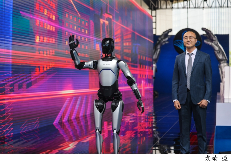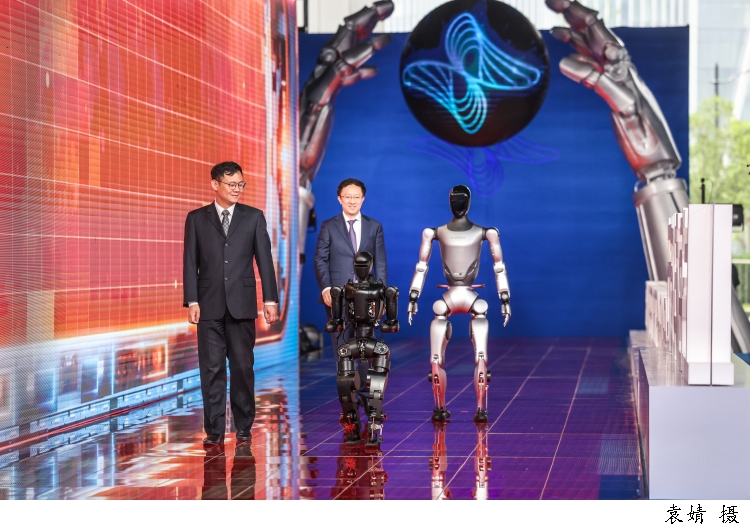 图为上海智元新创技术有限公司通用产品线总裁王闯带着智元远征A2机器人走上科学红毯。