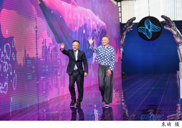图为上海科技馆馆长倪闽景、英国国家科学与媒体博物馆馆长乔•昆顿-图洛克(Jo Quinton-Tulloch)走上科学红毯。