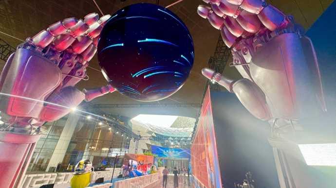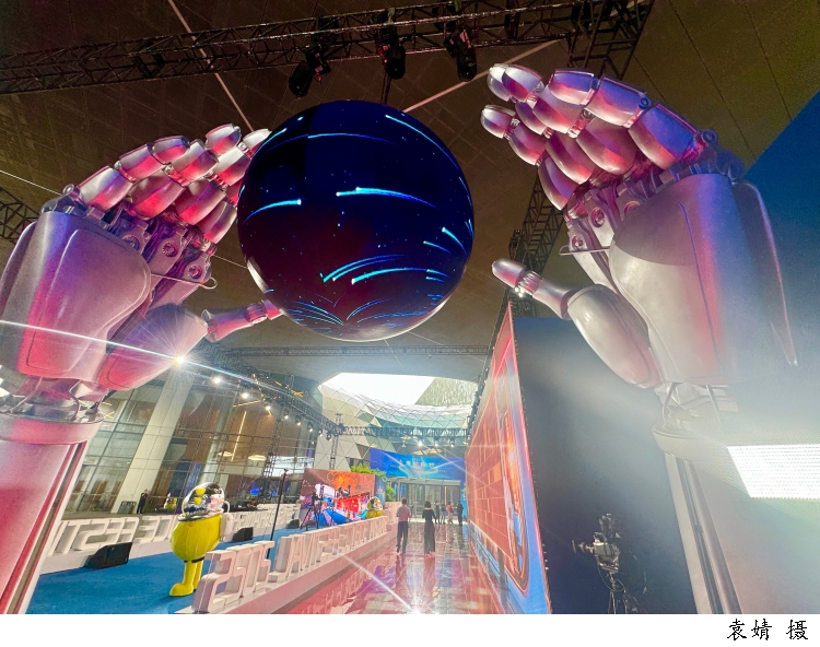图为本届科技节“AI科学红毯”首次引入XR空间拓展技术,通过虚拟背景实时生成与现实场景融合,形成无限延展的视觉空间。装置内部集成AI无感动捕系统,可实时捕捉嘉宾动作,叠加AI动态特效,实现人与虚拟环境的高精度互动。